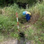 ⑤デジカメで画像を納めて調査終了です。一見すると地味な作業ですが、調査ポイントまでたどり着くだけでも法面を30m上がることもあったり枝切ばさみと草刈鎌を使っていく作業は重労働でした。20箇所/日を調査するには法面に対する作業経験と冷静に実行する体力も要りました。※真夏だったので1日5~6キロ程度歩くので3L~4Lの水分摂取が必要でした。